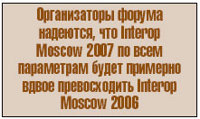 Однако организаторы форума не унывают и надеются, что Interop Moscow 2007 (его проведение намечено на 14—16 ноября будущего года) по всем параметрам (общая площадь, количество участников и т. д.) будет примерно вдвое превосходить Interop Moscow 2006.