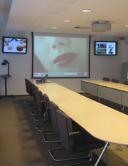 В центре кабинета, предназначенного для проведения встреч, совещаний и тренингов, теперь размещен экран прямой проекции, а сбоку от него расположены плазменные 42-дюймовые панели.