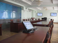 Единая система управления Crestron позволяет контролировать все устройства и режимы функционирования аудиовизуального оборудования зала. На столе командующего установлена интерактивная панель Crestron, с помощью которой он может вносить комментарии в демонстрируемые с помощью системы отображения информации коллективного пользования презентационные материалы и видеофрагменты.